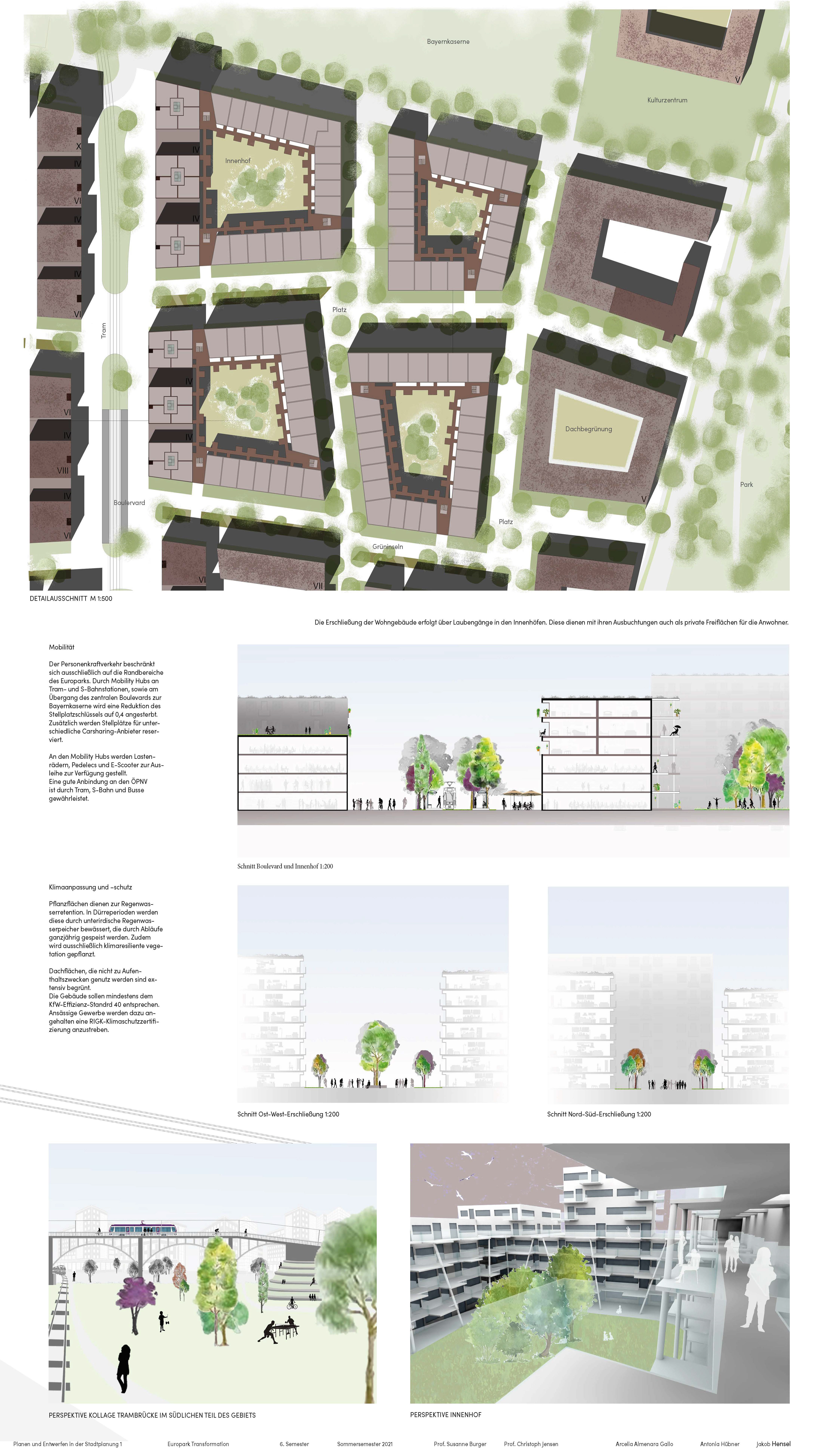 Die ehemalige Bayernkaserne im Münchner Norden erfährt aktuell eine grundlegende Umwandlung in ein neues Stadtquartier. Zur besseren Erschließung soll dafür die Tramlinie 23 vom ebenfalls neu entwickelten Domagkpark Richtung Norden über den Güterring verlängert werden. Dabei wird sie den Europark durchqueren, der in seiner derzeitigen flächenextensiven Nutzung, angesichts des starken Wohnungs- und Fächendrucks, nicht mehr zeitgemäß ist. Das Ziel der Aufgabe besteht darin, eine innovative Nutzungsmischung aus Gewerbe und Wohnen zu entwickeln und Möglichkeiten aufzuzeigen, wie die Flächennutzung insgesamt erhöht und trotzdem ein attraktives Wohnquartier entstehen kann.